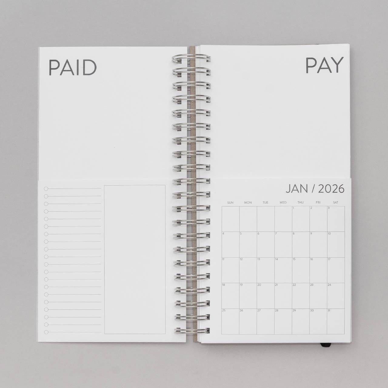 Organizing your bills has never been easier. When you get a bill in the mail, put it in the "pay" pocket and fill in the due date on the calendar. When you pay the bill, move it to the "paid" side and check it off your list.